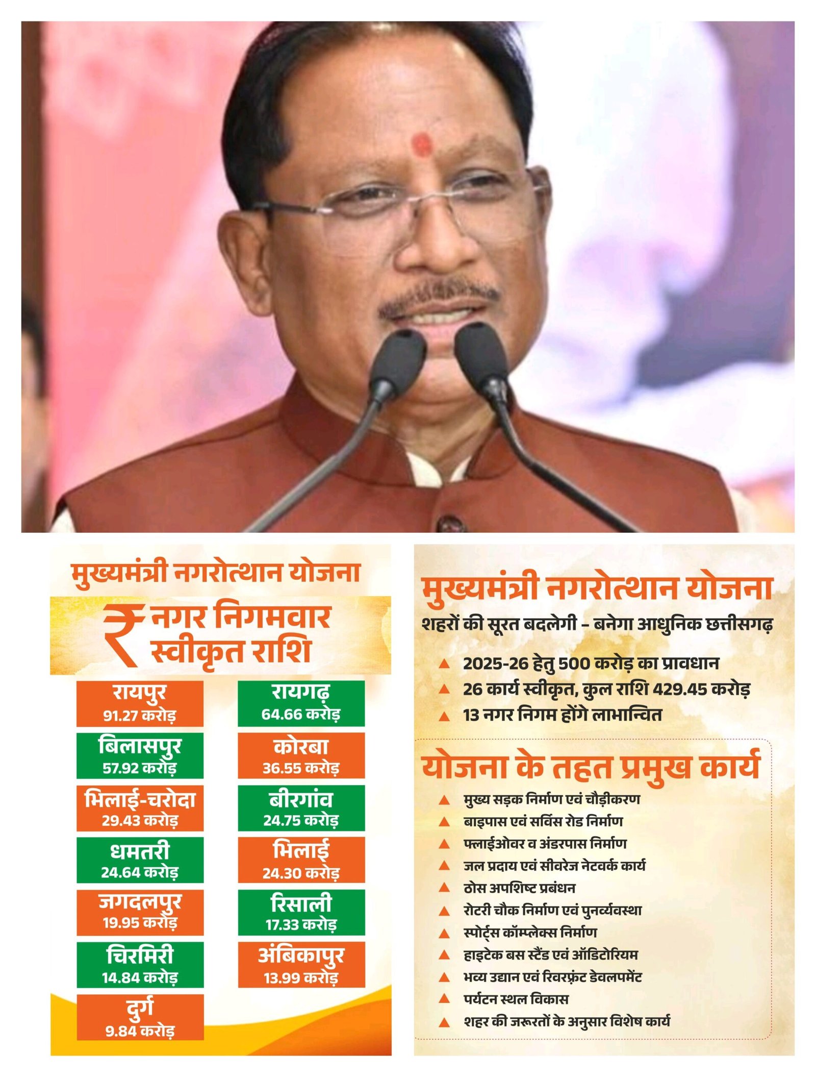 मुख्यमंत्री श्री विष्णु देव साय ने राज्य शासन की महत्वाकांक्षी मुख्यमंत्री नगरोत्थान योजना के बारे में कहा कि इस योजना से शहरों के अधोसंरचना विकास में बड़ा बदलाव आएगा। शहरों के सतत् विकास और नागरिक केंद्रित समाधानों को ध्यान में रखते हुए यह योजना तैयार की गई है। छत्तीसगढ़ के शहरों को आधुनिक, सुंदर और जीवंत बनाने में यह योजना प्रभावी साबित होगी। शहरों की सूरत और सीरत बदलने में इसकी अहम भूमिका होगी।